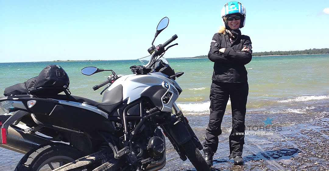 Steven lives on Manitoulin and has been riding a motorcycle around the island, longer than any of us—in fact, all his life. He knows his way around. One brief turn off the main road and he leads us onto an entirely different landscape that we’d never have discovered otherwise. The feeling of being up on the pegs of my BMW F700GS, weaving the bike over the packed dirt road accented by sand, mud puddles and gravel, all amidst canopied woods –simply thrilling! And when the dirt road ended, opening up to a clearing, the surface changed to the island’s core of blackened limestone. We rode across it to Lake Huron’s edge and let the water lap against our tires. At this point, our cameras all came out–not one of us intended on missing this chance to record an incredibly splendid scene. “Yes, this is riding Manitoulin!”